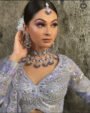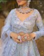 The lehenga skirt flows gracefully in a luminous silver hue, embellished with elaborate motifs and fine craftsmanship that shimmer subtly with every movement. Paired with a soft, sheer net dupatta highlighted with delicate accents, this ensemble exudes sophistication and poise.