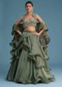 Turn heads with the contemporary elegance of the Olive Aura Ruffle Lehenga Set, designed for those who love bold silhouettes blended with refined craftsmanship.